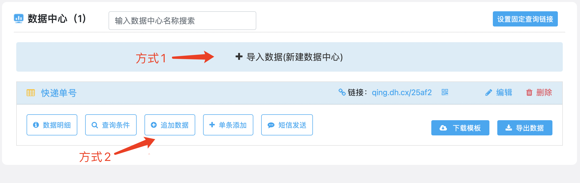 数据导入有两种方式,方式1是直接新建数据中心导入excel表格数据,方式2是追加数据